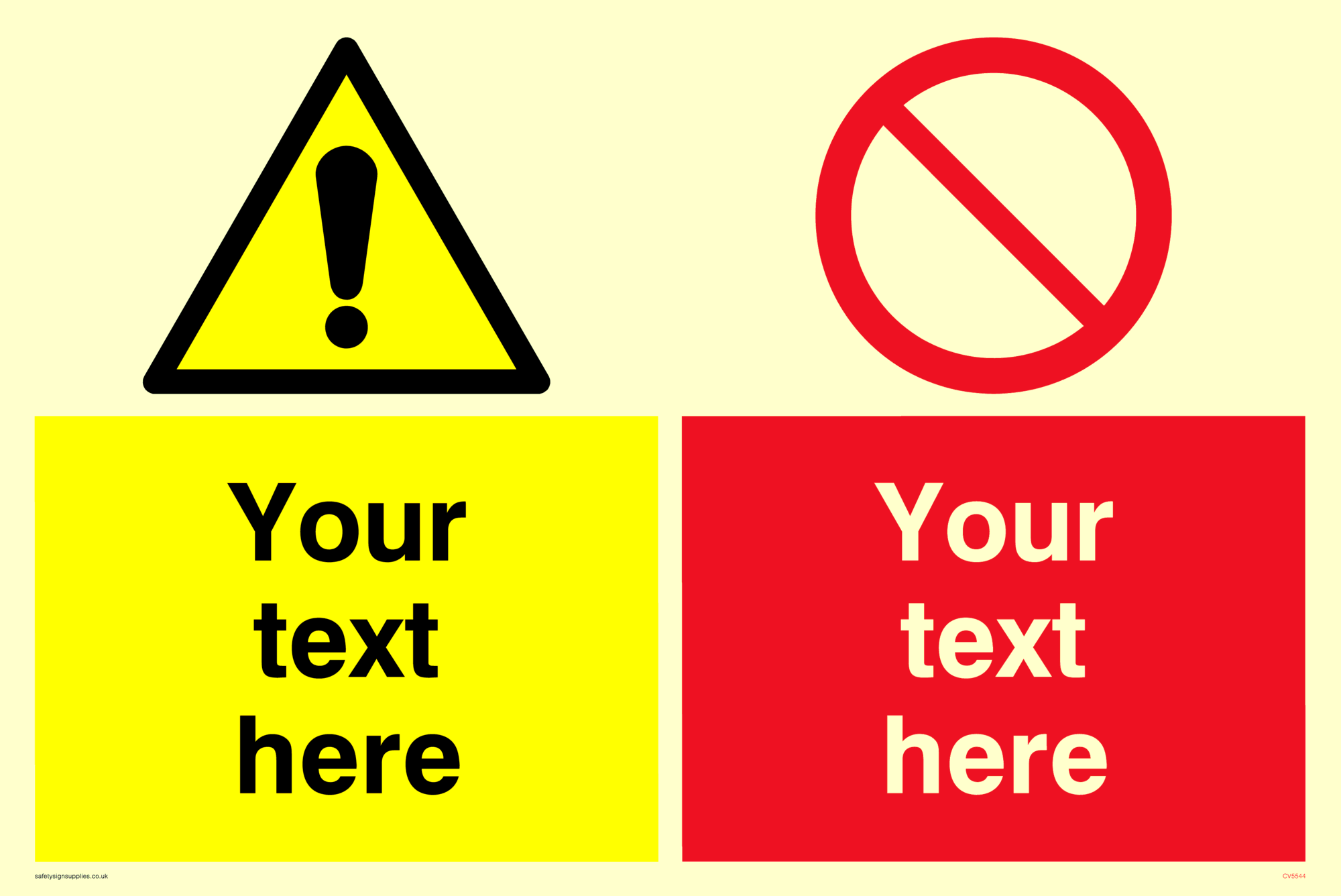 This sign contains a warning Exclamation Symbol - black exclamation mark on yellow triangle background. This sign contains a red prohibition circle and line diagonally crossed through. Comes with a self adhesive backing.