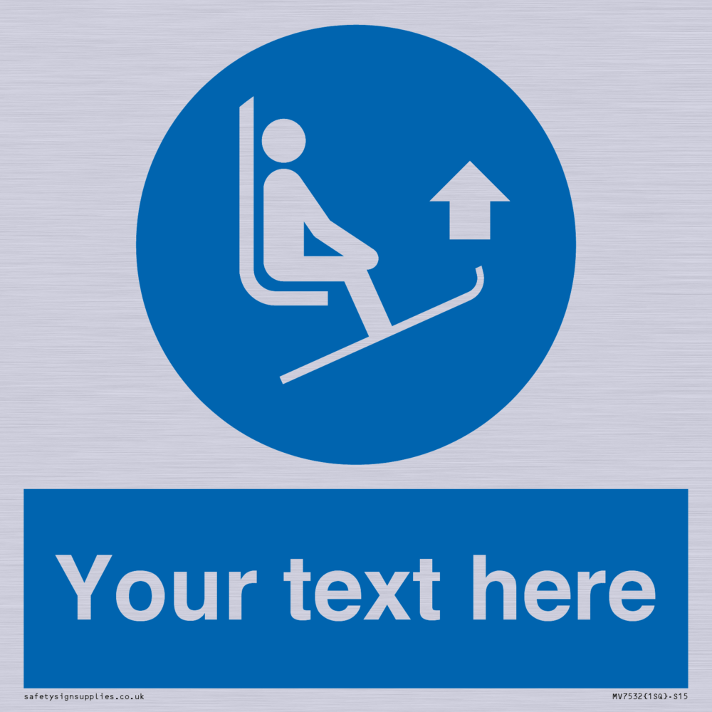 Image content: Human figure (right-hand profile) with skis sitting in chairlift, arrow pointing upwards.