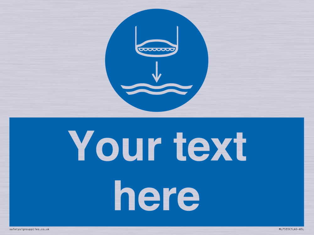 Image content: Lifeboat on two falls, arrow pointing down, two wavy lines.