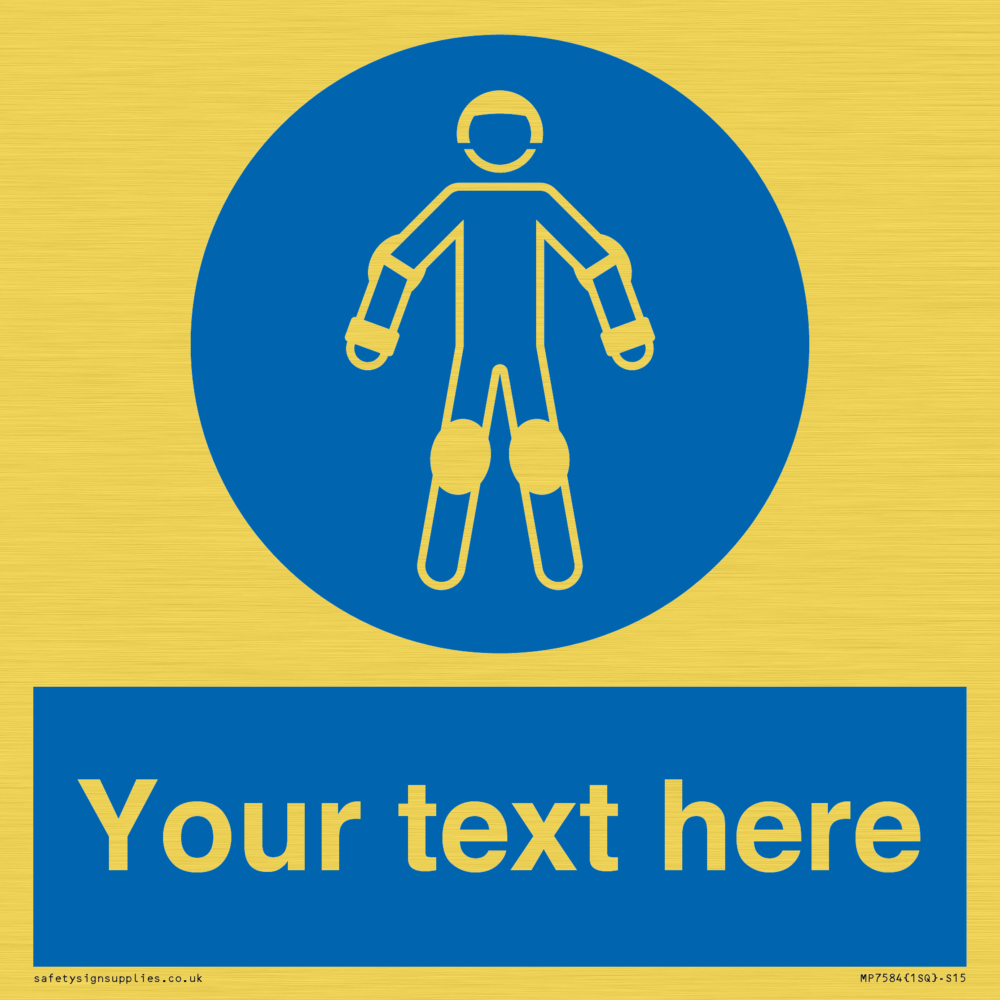 Image content: Human figure (outlined) wearing head, wrist, palm, knee and elbow protectors.