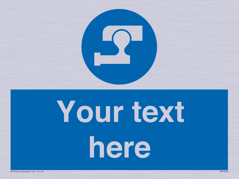 Suitable for hanging installation. Suitable for mounting on a flat surface. Suitable for mounting on a door. Custom signs contain the text required by the customer. With your your text and a standard safety sign symbol - a bespoke sign can fit any requirement. Signs in this range are from our standard range.