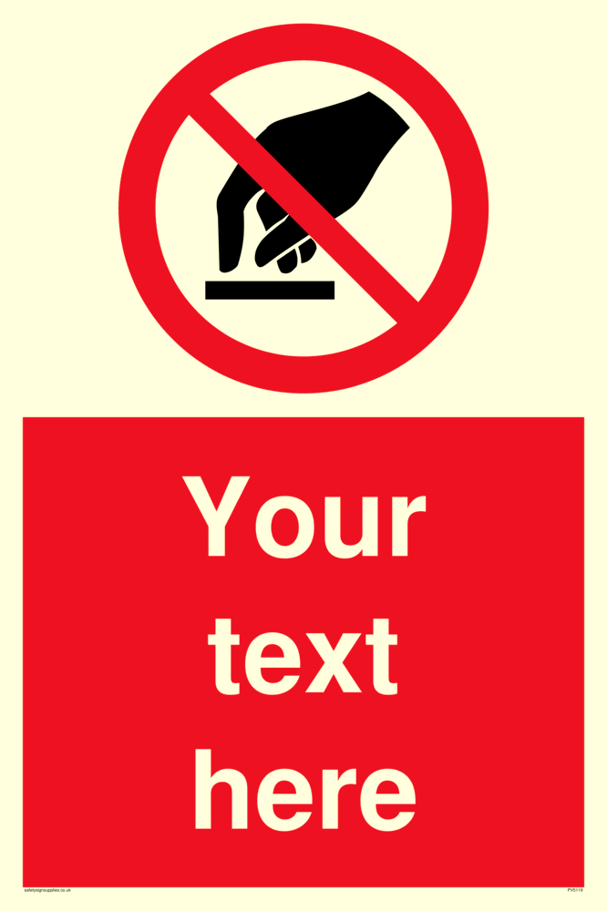 This sign contains a do not touch symbol - hand in black with red prohibition circle crossed through with diagonal line.