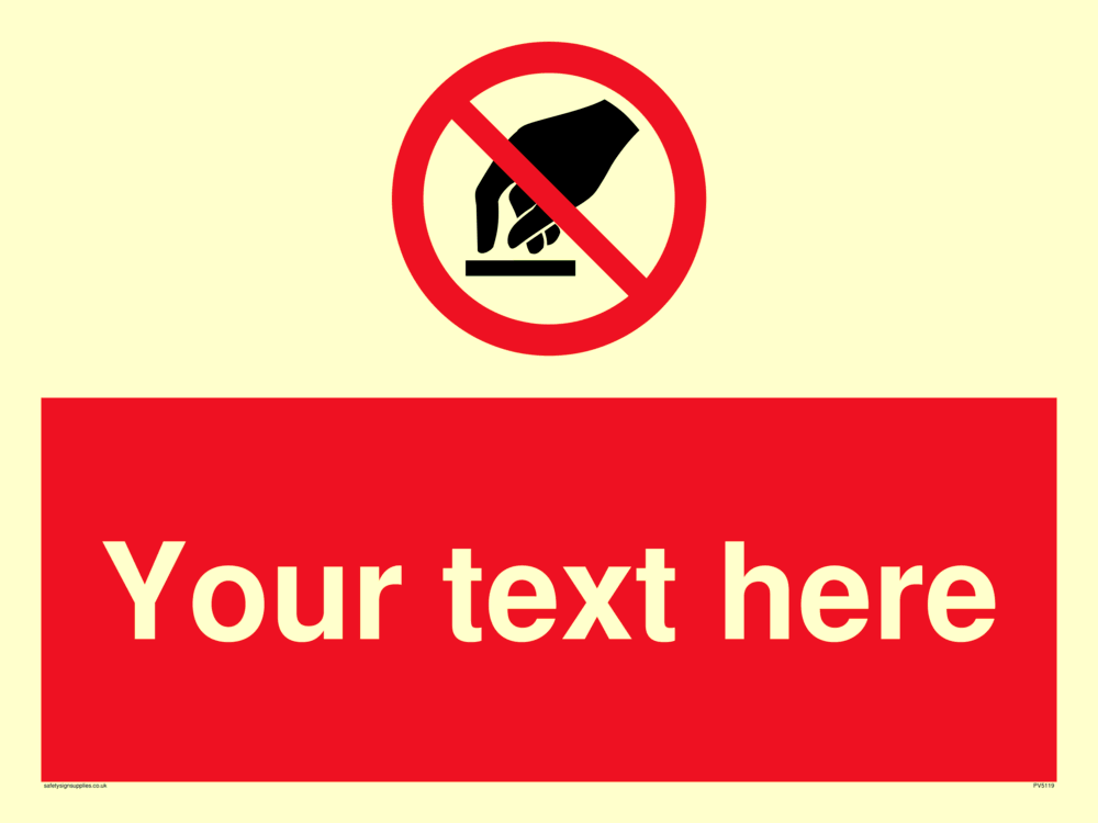 This sign contains a do not touch symbol - hand in black with red prohibition circle crossed through with diagonal line.