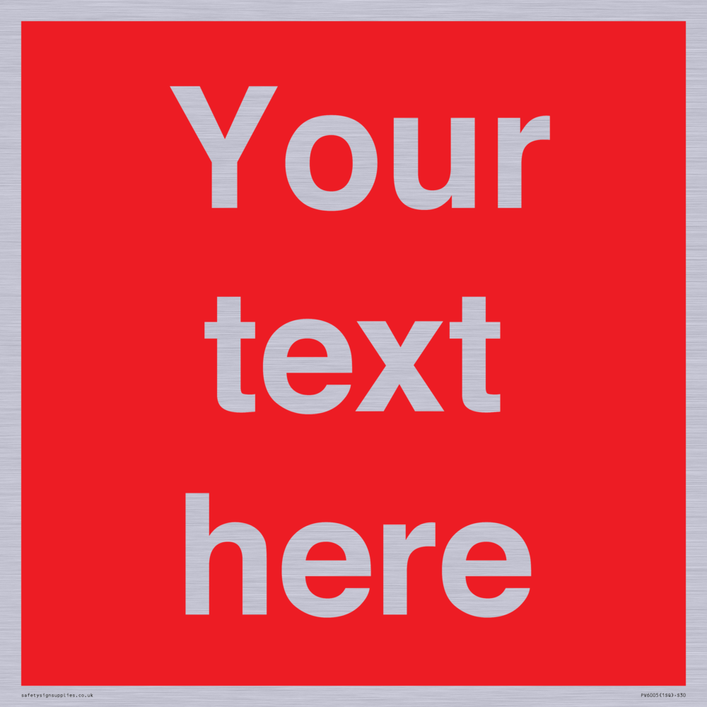 Sign Text: Your text here Product Type: Prohibition Safety Signs Dimensions: 300x300mm Material: Brushed silver aluminum with 2 channel Orientation: Square Text Colour: White More...