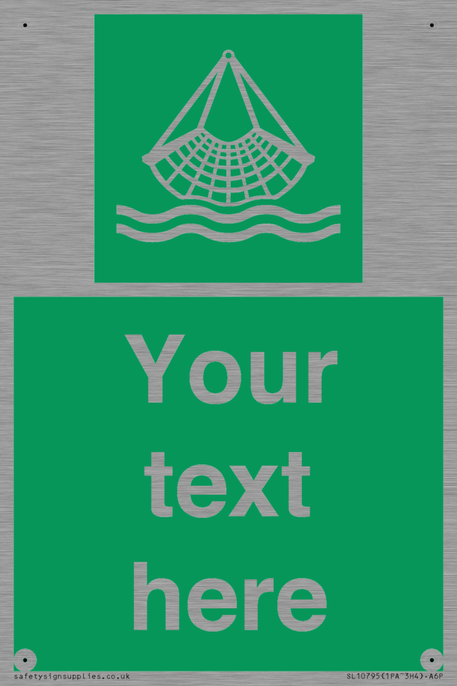 E928 Safe condition: Person overboard equipment symbol. To indicate the location of person overboard / man overboard equipment. Commonly known as a Jasons Cradle.