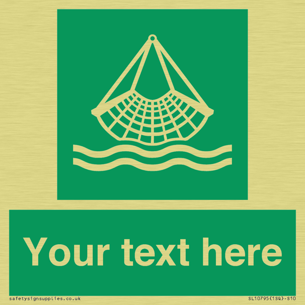 E928 Safe condition: Person overboard equipment symbol. To indicate the location of person overboard / man overboard equipment. Commonly known as a Jasons Cradle.
