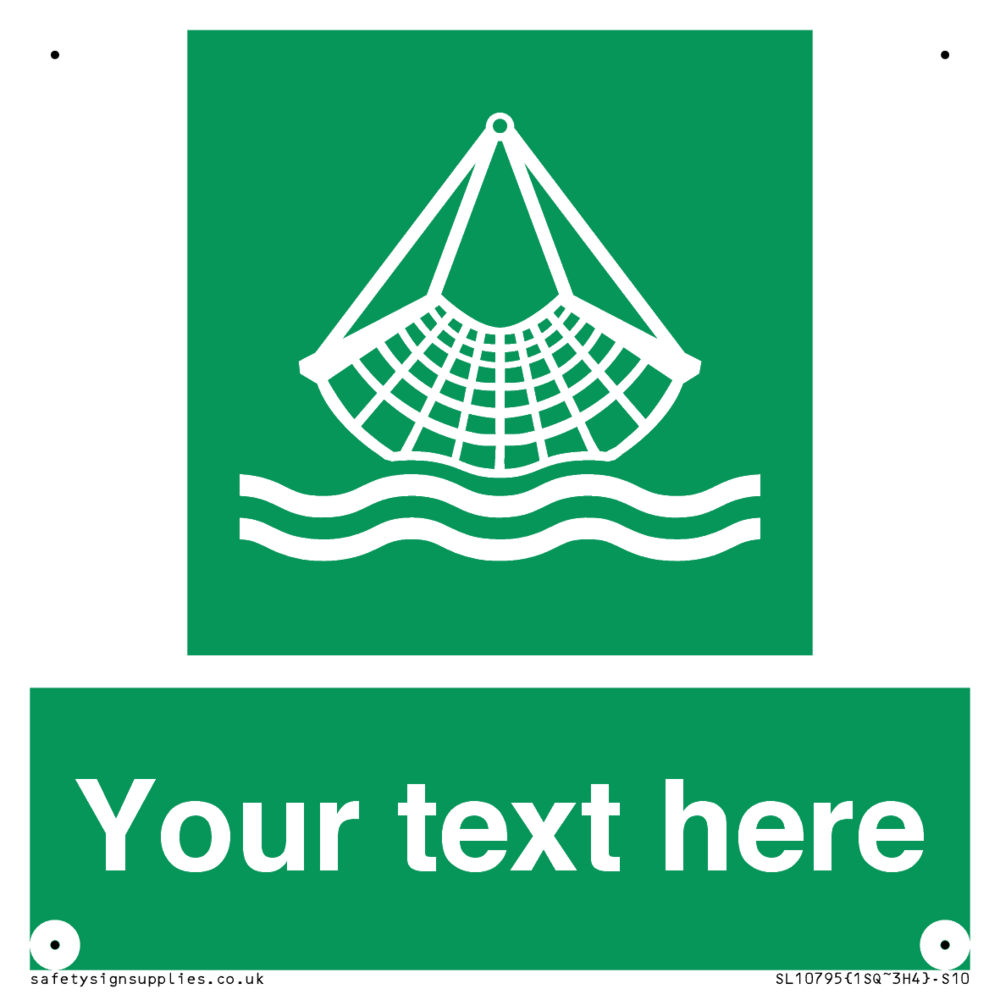E928 Safe condition: Person overboard equipment symbol. To indicate the location of person overboard / man overboard equipment. Commonly known as a Jasons Cradle.