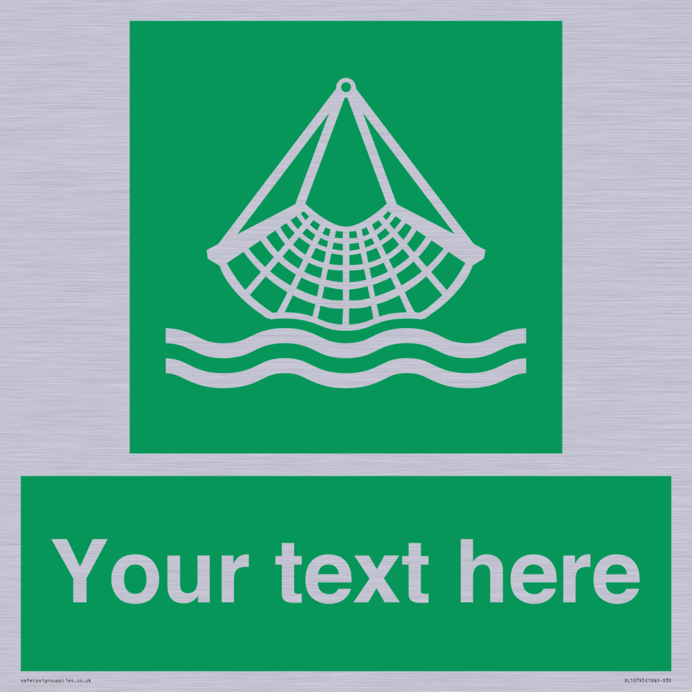 E928 Safe condition: Person overboard equipment symbol. To indicate the location of person overboard / man overboard equipment. Commonly known as a Jasons Cradle.