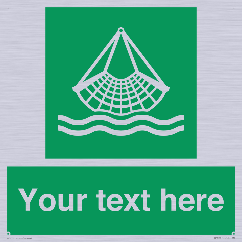E928 Safe condition: Person overboard equipment symbol. To indicate the location of person overboard / man overboard equipment. Commonly known as a Jasons Cradle.