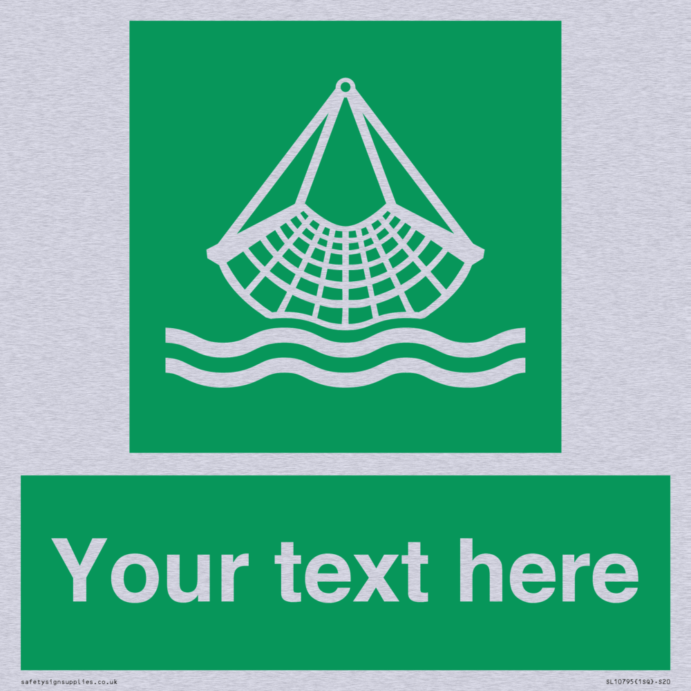 E928 Safe condition: Person overboard equipment symbol. To indicate the location of person overboard / man overboard equipment. Commonly known as a Jasons Cradle.
