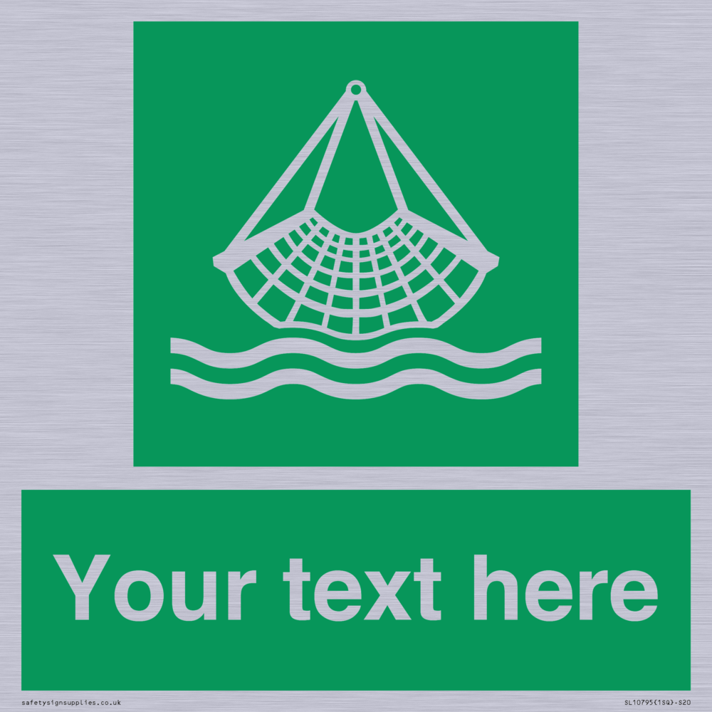 E928 Safe condition: Person overboard equipment symbol. To indicate the location of person overboard / man overboard equipment. Commonly known as a Jasons Cradle.