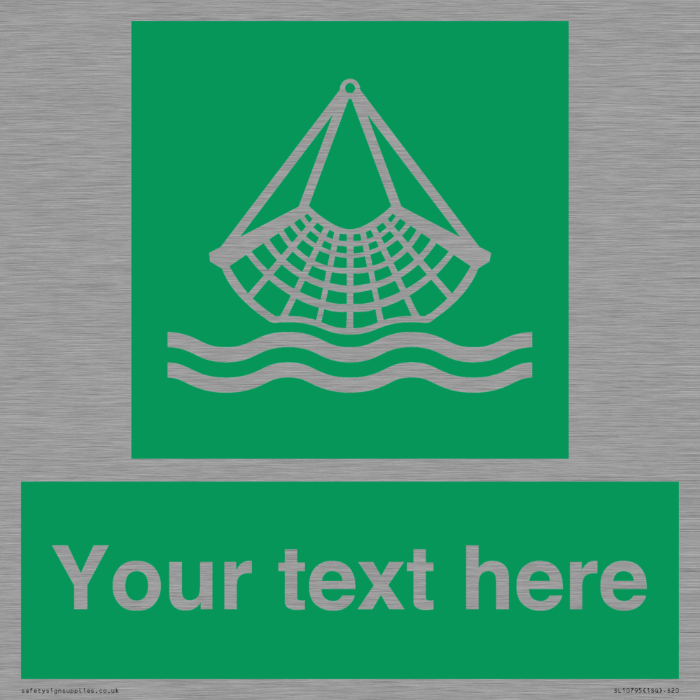 E928 Safe condition: Person overboard equipment symbol. To indicate the location of person overboard / man overboard equipment. Commonly known as a Jasons Cradle.
