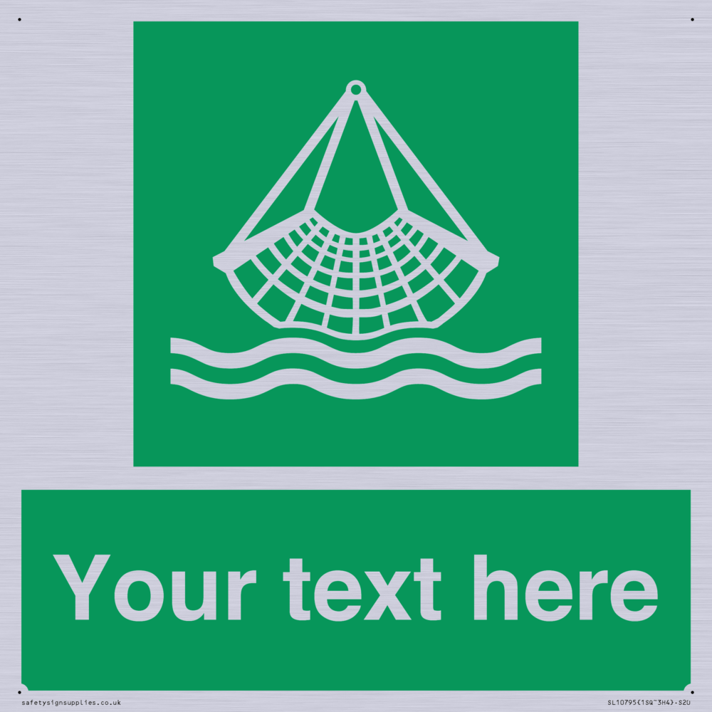 E928 Safe condition: Person overboard equipment symbol. To indicate the location of person overboard / man overboard equipment. Commonly known as a Jasons Cradle.