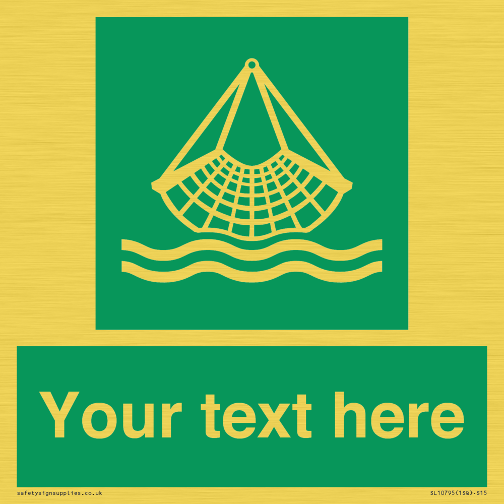 E928 Safe condition: Person overboard equipment symbol. To indicate the location of person overboard / man overboard equipment. Commonly known as a Jasons Cradle.