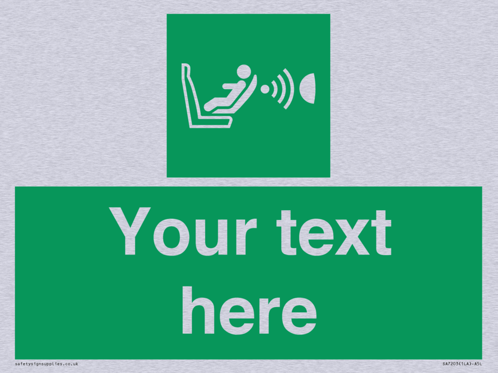Image content: Vehicle passenger seat, child in rear-facing child seat, dot, three curved lines of increasing size radiating from the dot, filled semi-circle.
