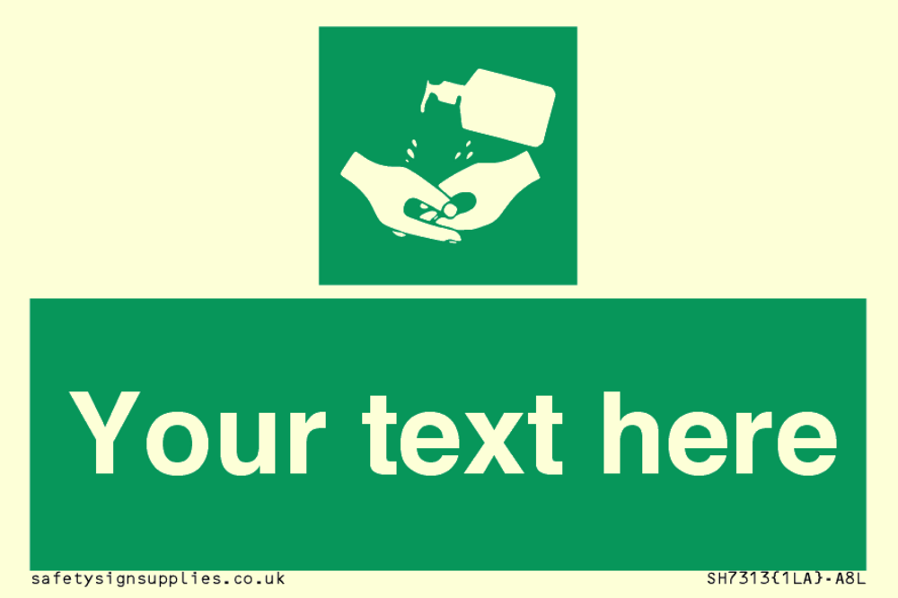 Thickness / Depth: 170microns Durability: 3-5 years Mounting Surface: flat Materials: Sticker Material Colour: Glow in the Dark Custom Text: Yes Language: ENGLISH Language (EN) Symbol: E915 : Hand sanitiser Internal Layout: 1LA : 1 landscape pod in a Landscape Region: UK