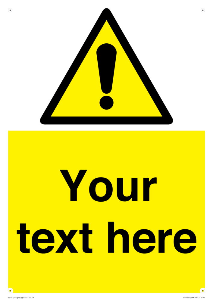 Custom warning safety sign with warning symbol - black exclamation in yellow triangle.