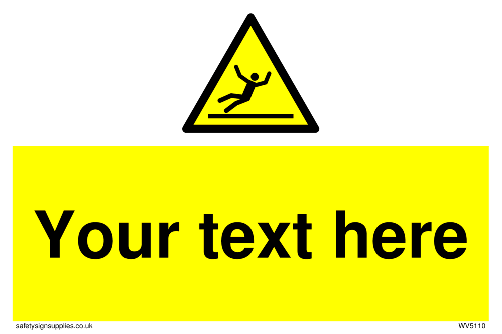 This sign contains a slippery surface warning symbol. Person slipping on wet floor in black in yellow warning triangle with black border.