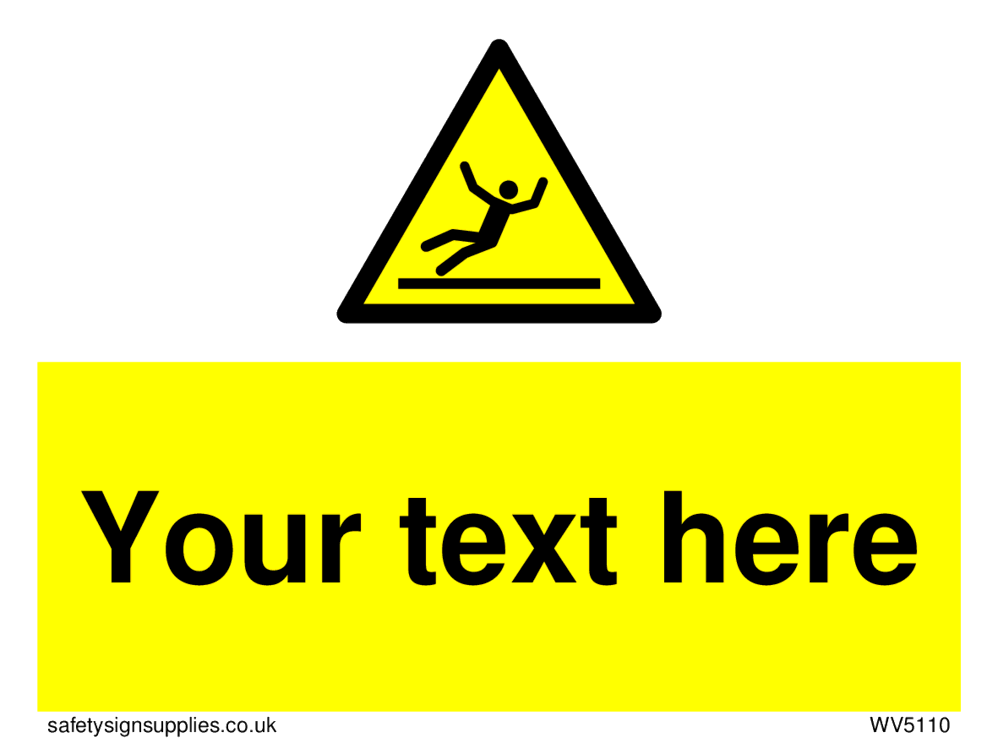 This sign contains a slippery surface warning symbol. Person slipping on wet floor in black in yellow warning triangle with black border.