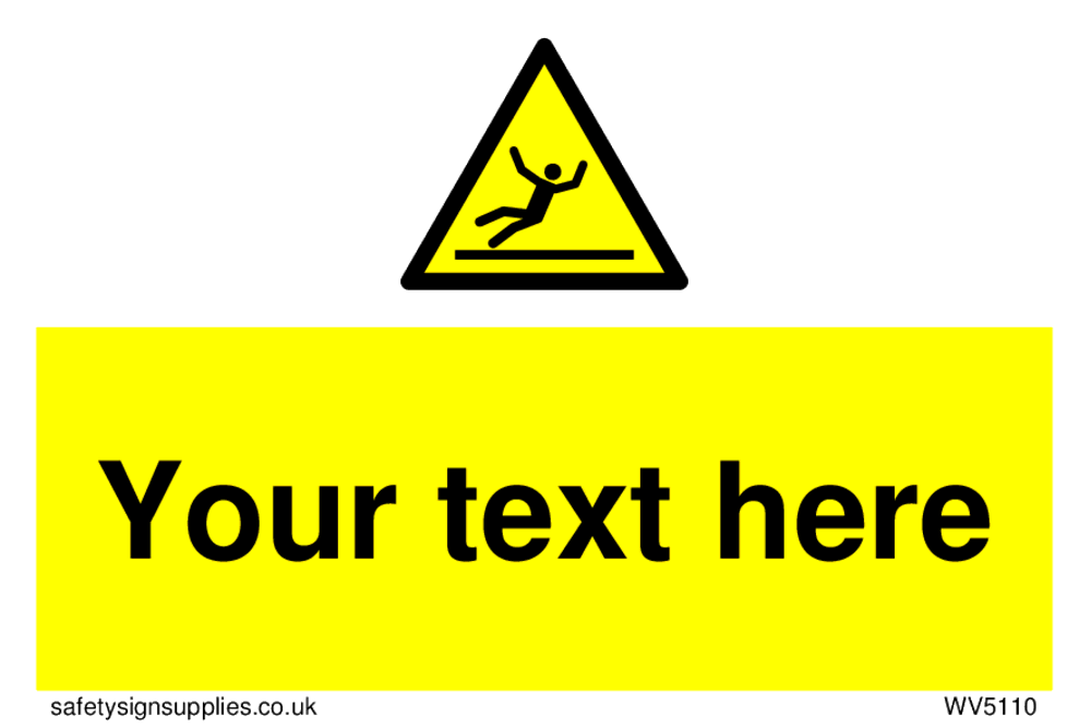 This sign contains a slippery surface warning symbol. Person slipping on wet floor in black in yellow warning triangle with black border.