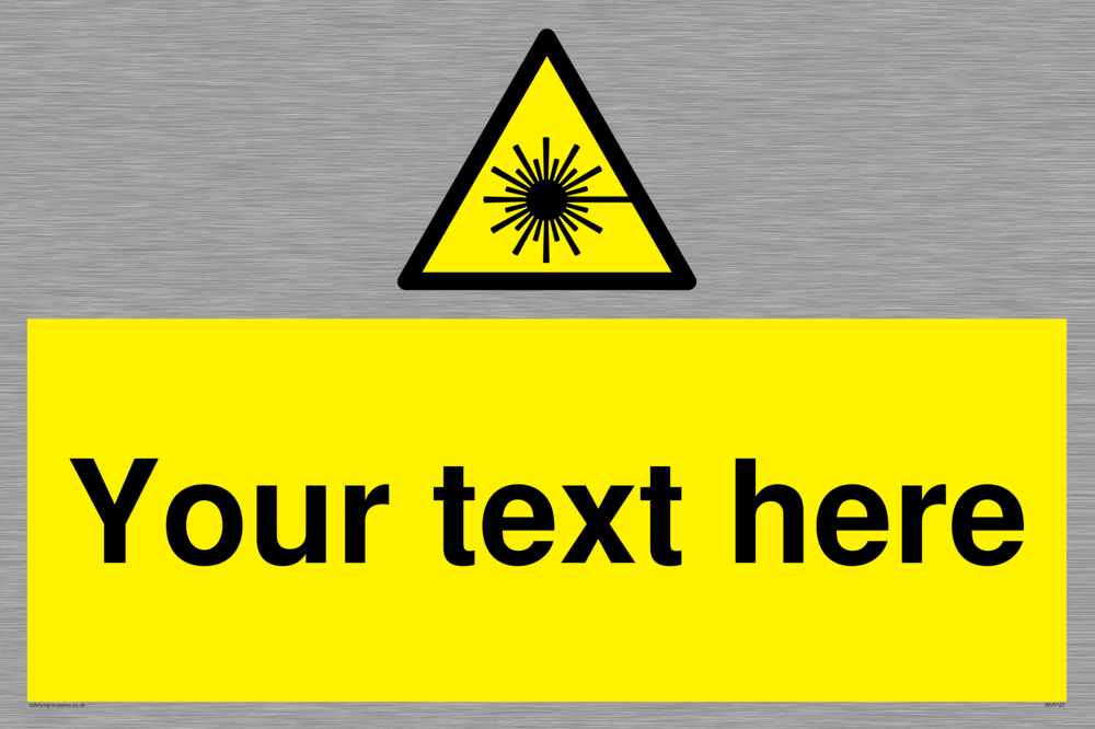 This sign contains an international standard laser warning symbol. Laser beam and star burst in black on yellow warning triangle with black border. Suitable for fixing with screws. Suitable for hanging with a premium hanging kit.