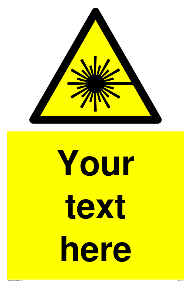 This sign contains an international standard laser warning symbol. Laser beam and star burst in black on yellow warning triangle with black border.
