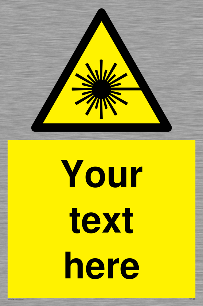 This sign contains an international standard laser warning symbol. Laser beam and star burst in black on yellow warning triangle with black border. Suitable for fixing with screws. Suitable for hanging with a premium hanging kit.