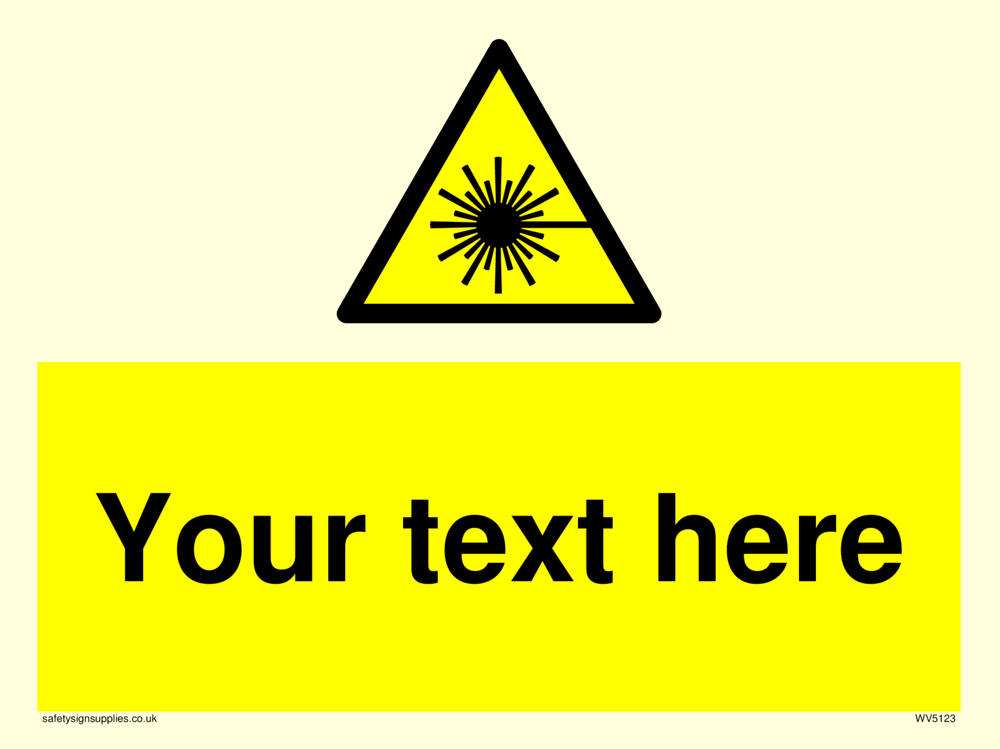 This sign contains an international standard laser warning symbol. Laser beam and star burst in black on yellow warning triangle with black border. Comes with a self adhesive backing. 150mm or approximately 6" high.