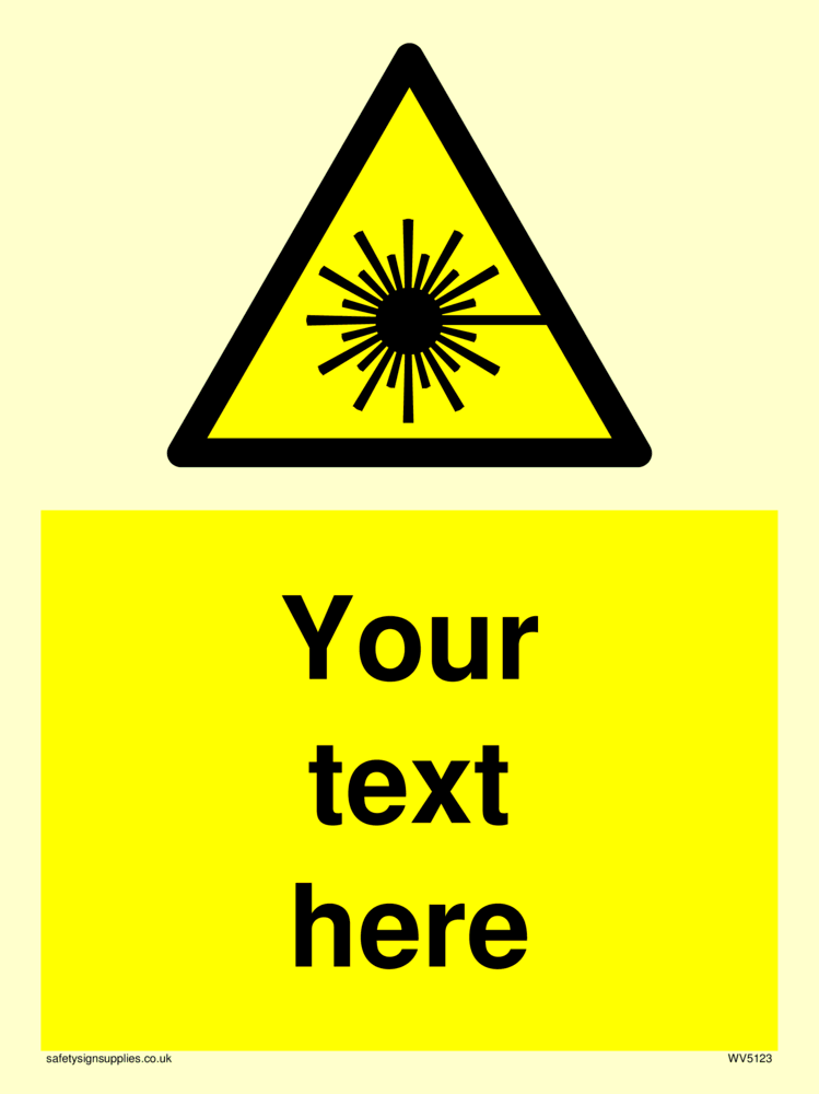 This sign contains an international standard laser warning symbol. Laser beam and star burst in black on yellow warning triangle with black border.