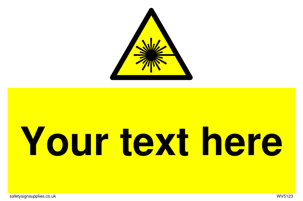 This sign contains an international standard laser warning symbol. Laser beam and star burst in black on yellow warning triangle with black border.