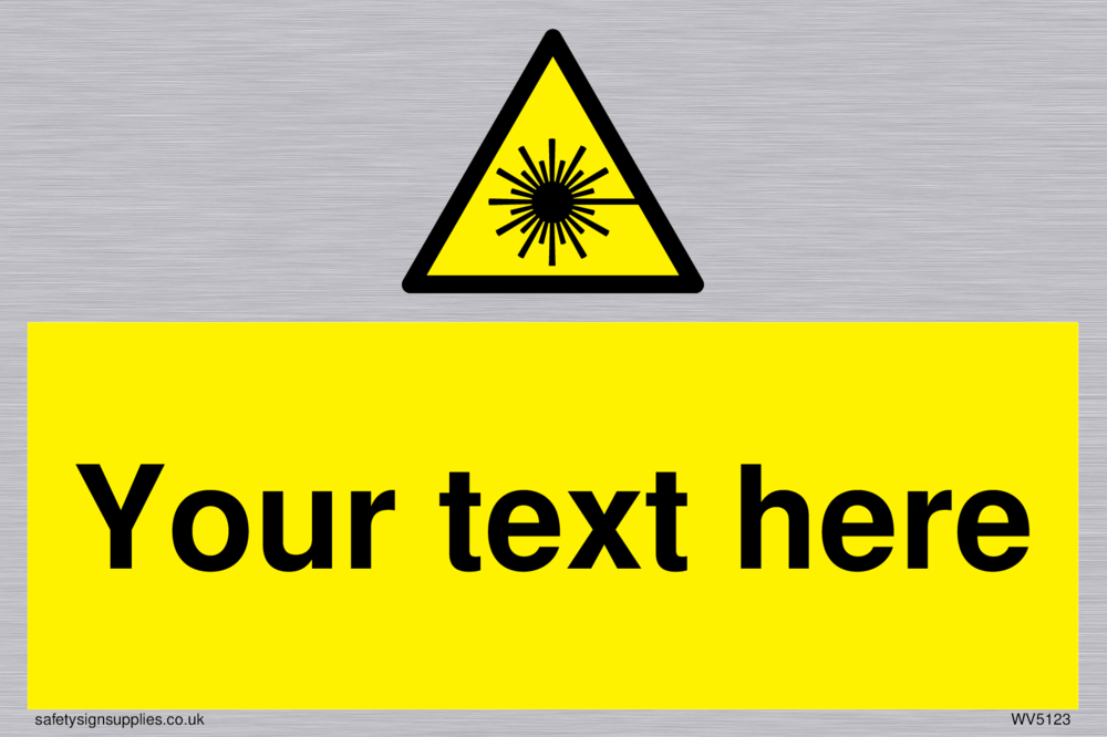 This sign contains an international standard laser warning symbol. Laser beam and star burst in black on yellow warning triangle with black border. Suitable for fixing with screws. Suitable for hanging with a premium hanging kit.