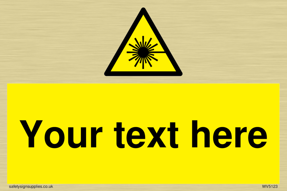 This sign contains an international standard laser warning symbol. Laser beam and star burst in black on yellow warning triangle with black border. Comes with a self adhesive backing. 100mm or approximately 4" high.