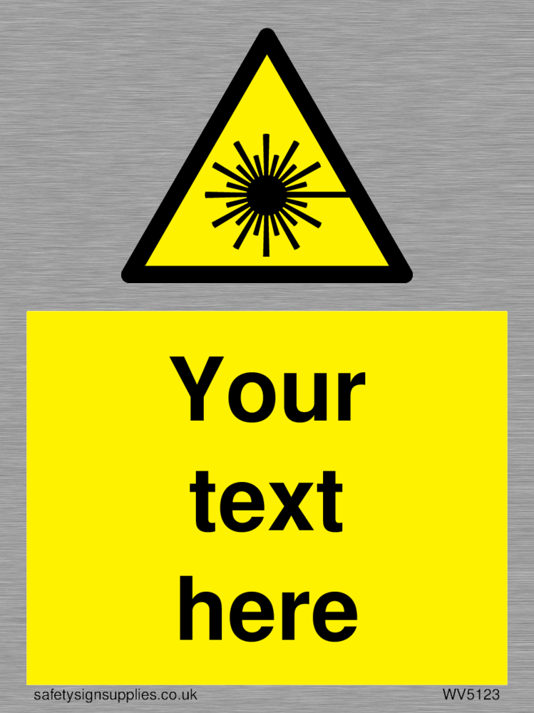 This sign contains an international standard laser warning symbol. Laser beam and star burst in black on yellow warning triangle with black border. Suitable for fixing with screws. Suitable for hanging with a premium hanging kit.