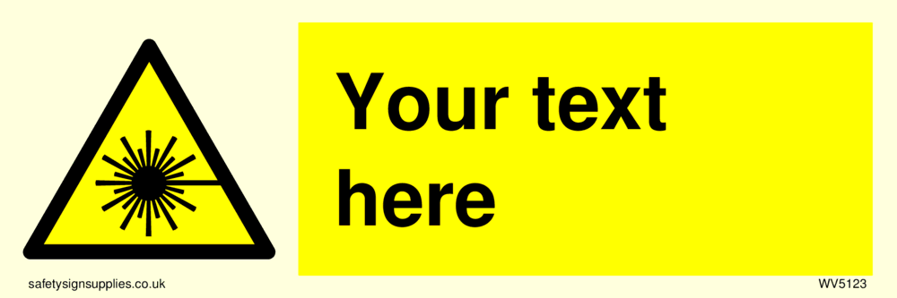 This sign contains an international standard laser warning symbol. Laser beam and star burst in black on yellow warning triangle with black border. Comes with a self adhesive backing. 50mm or approximately 2" high