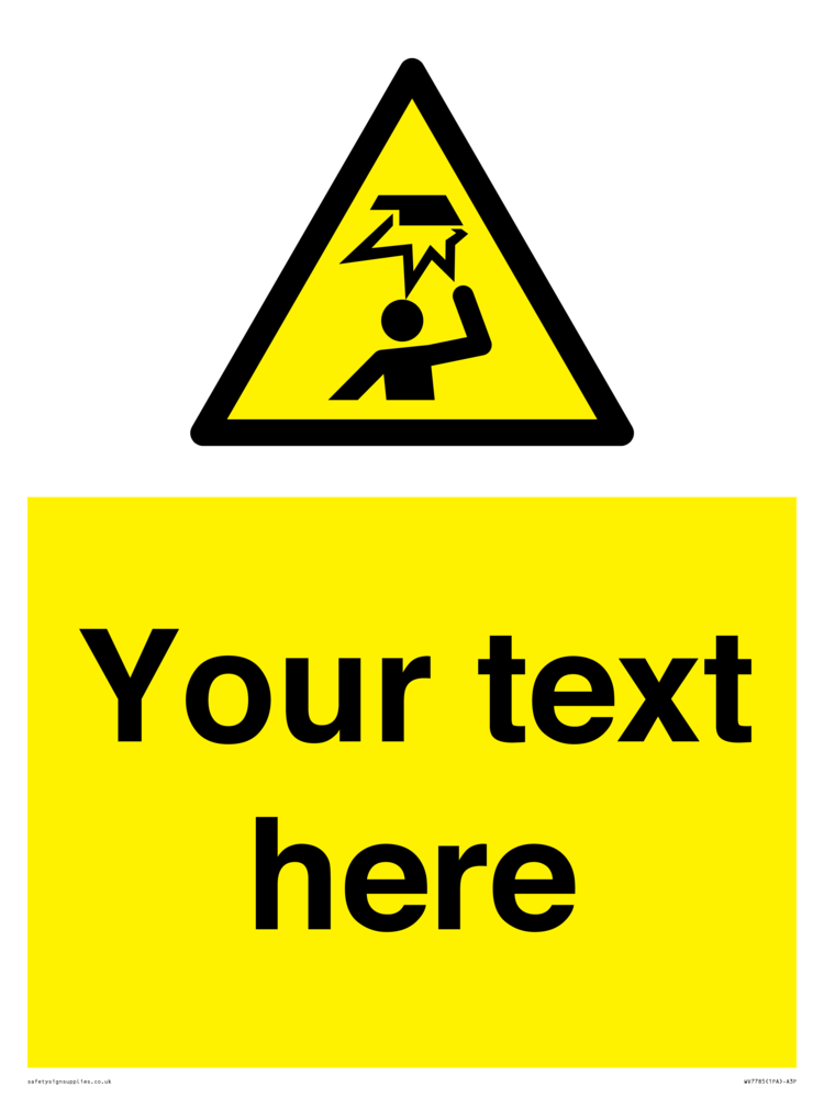 Suitable for mounting on a flat surface. Suitable for mounting on a door. Suitable for mounting on cladding. This product is design to be mounted on the ceiling. Custom signs contain the text required by the customer. With your your text and a standard safety sign symbol - a bespoke sign can fit any requirement.