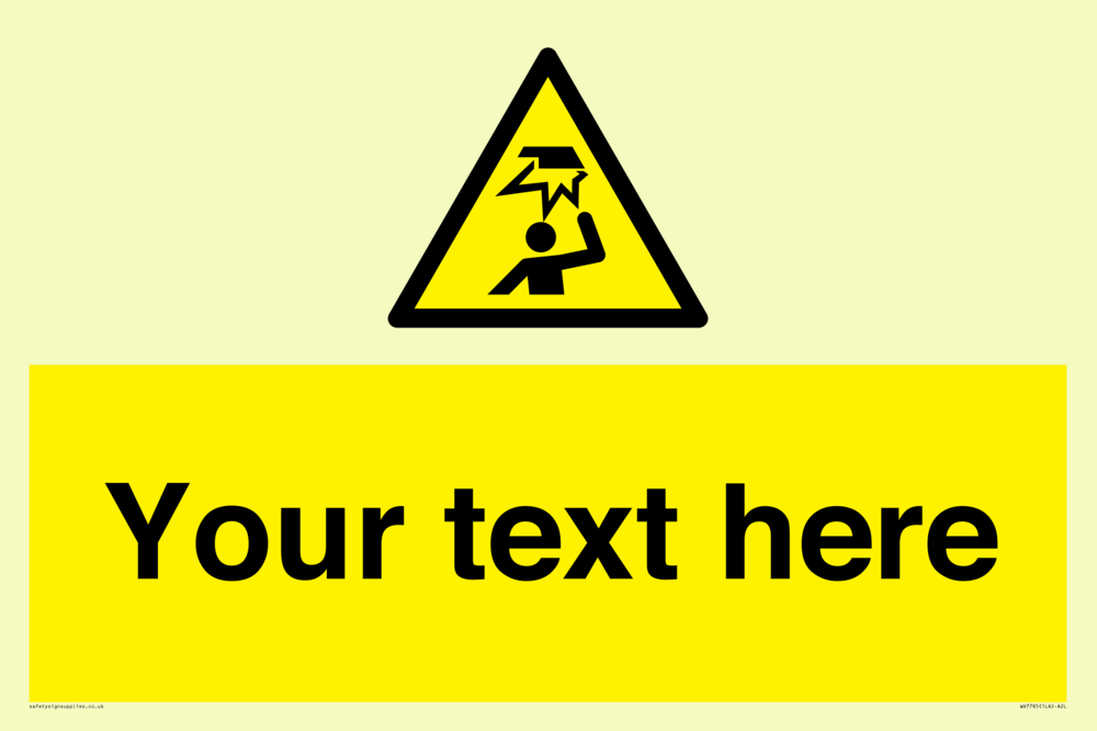 Suitable for mounting on a door. Suitable for mounting on cladding. This product is design to be mounted on the ceiling. Custom signs contain the text required by the customer. With your your text and a standard safety sign symbol - a bespoke sign can fit any requirement.