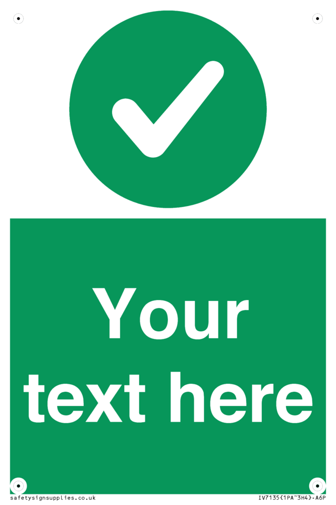 Sign Text: Your text here Dimensions: 100x150mm Material: Plastic semi rigid 1mm self adhesive Orientation: Portrait Text Colour: White Background Colour: Green More...