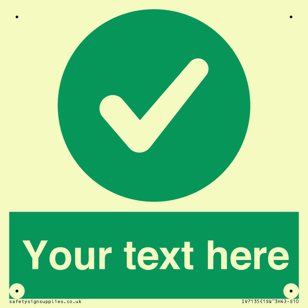 Sign Text: Your text here Dimensions: 100x100mm Material: Plastic Semi-rigid Photoluminescent Orientation: Square Text Colour: White Background Colour: Green More...