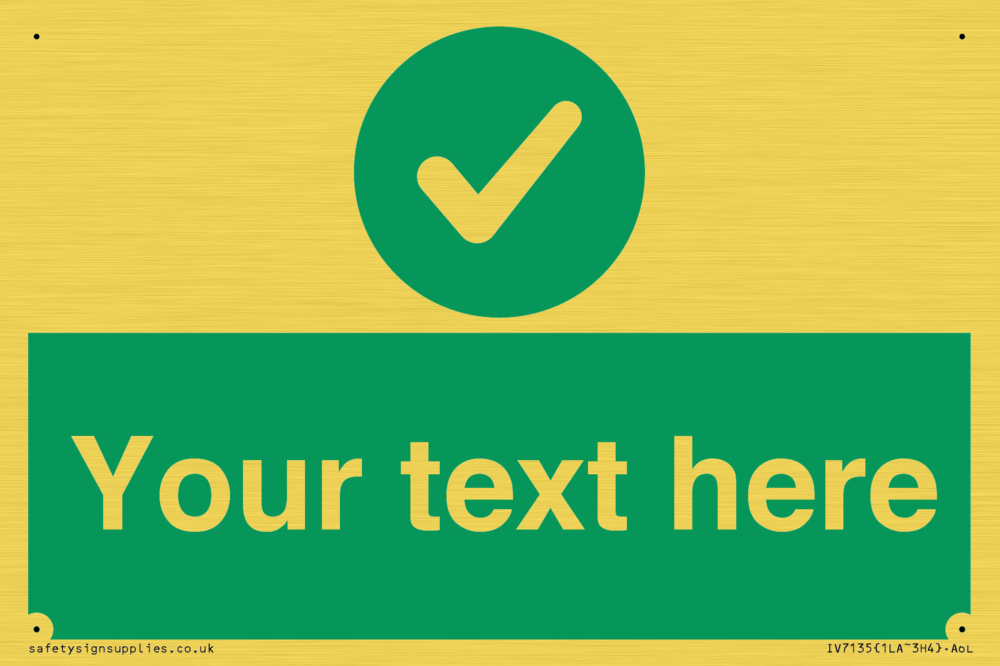 Thickness / Depth: 1.6mm Durability: 3-5 years Range: Standard Materials: Plastic Material Colour: Gold Language: ENGLISH Language (EN) Symbol: I023 : Green circle with tick Internal Layout: 1LA : 1 landscape pod in a Landscape Cut Configuration: 3mm Corner Holes Unit Dimension: 150x100mm Region: UK