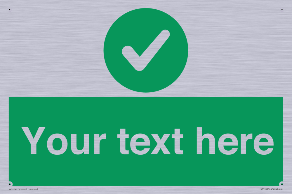 Sign Text: Your text here Dimensions: 300x200mm Material: Aluminium composite 3mm brushed silver Orientation: Landscape Text Colour: White Background Colour: Green More...