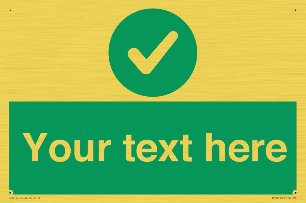 Thickness / Depth: 1.6mm Durability: 3-5 years Range: Standard Materials: Plastic Material Colour: Gold Language: ENGLISH Language (EN) Symbol: I023 : Green circle with tick Internal Layout: 1LA : 1 landscape pod in a Landscape Cut Configuration: 4mm Corner Holes Unit Dimension: 300x200mm Region: UK