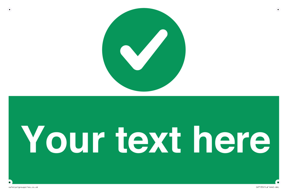 Sign Text: Your text here Dimensions: 300x200mm Material: Plastic semi rigid 1mm self adhesive Orientation: Landscape Text Colour: White Background Colour: Green More...