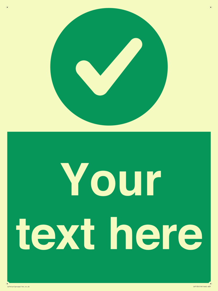 Sign Text: Your text here Dimensions: 300x400mm Material: Plastic Semi-rigid Photoluminescent Orientation: Portrait Text Colour: White Background Colour: Green More...