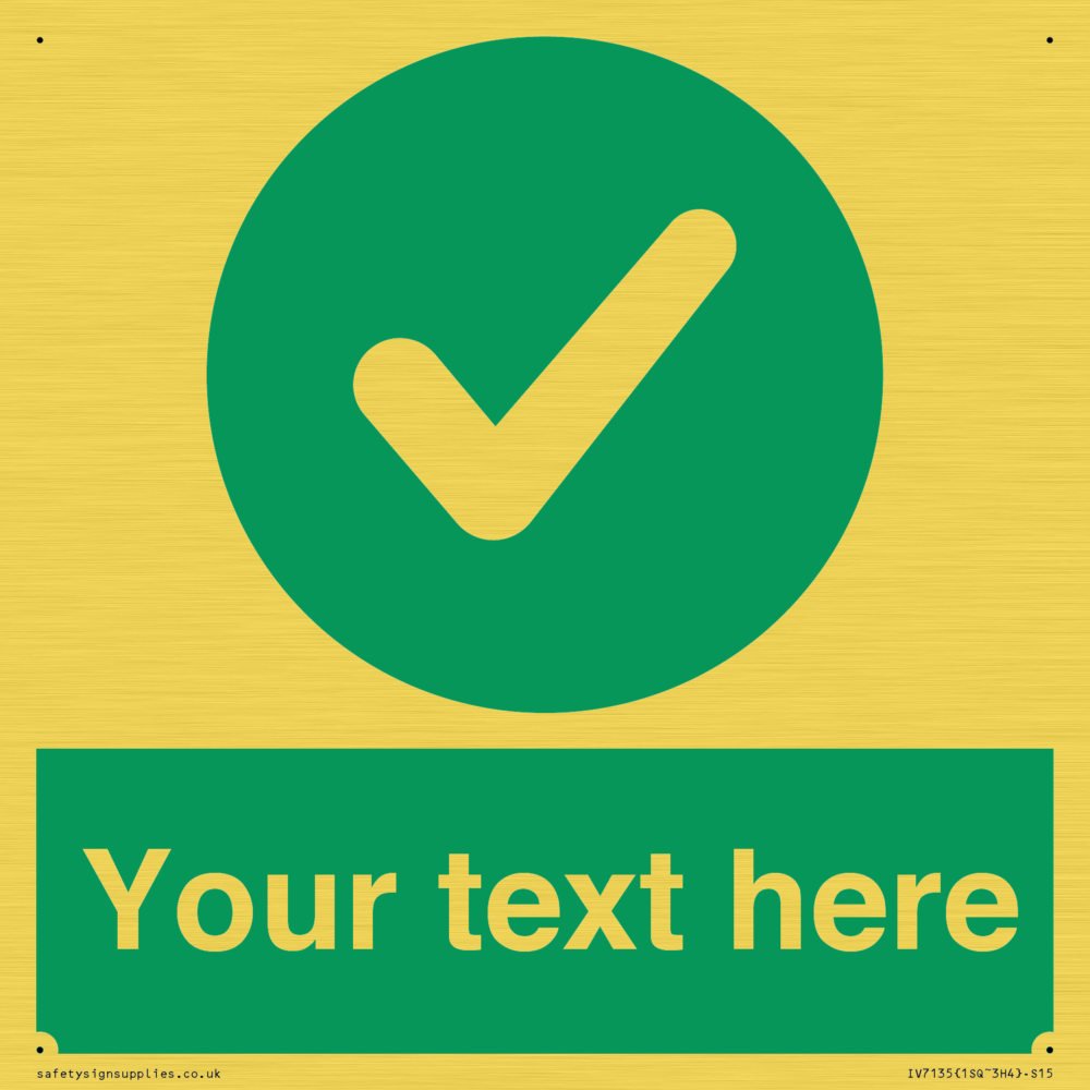 Thickness / Depth: 1.6mm Durability: 3-5 years Range: Standard Materials: Plastic Material Colour: Gold Language: ENGLISH Language (EN) Symbol: I023 : Green circle with tick Internal Layout: 1SQ : 1 square pod in a Square Cut Configuration: 3mm Corner Holes Unit Dimension: 150x150mm Region: UK