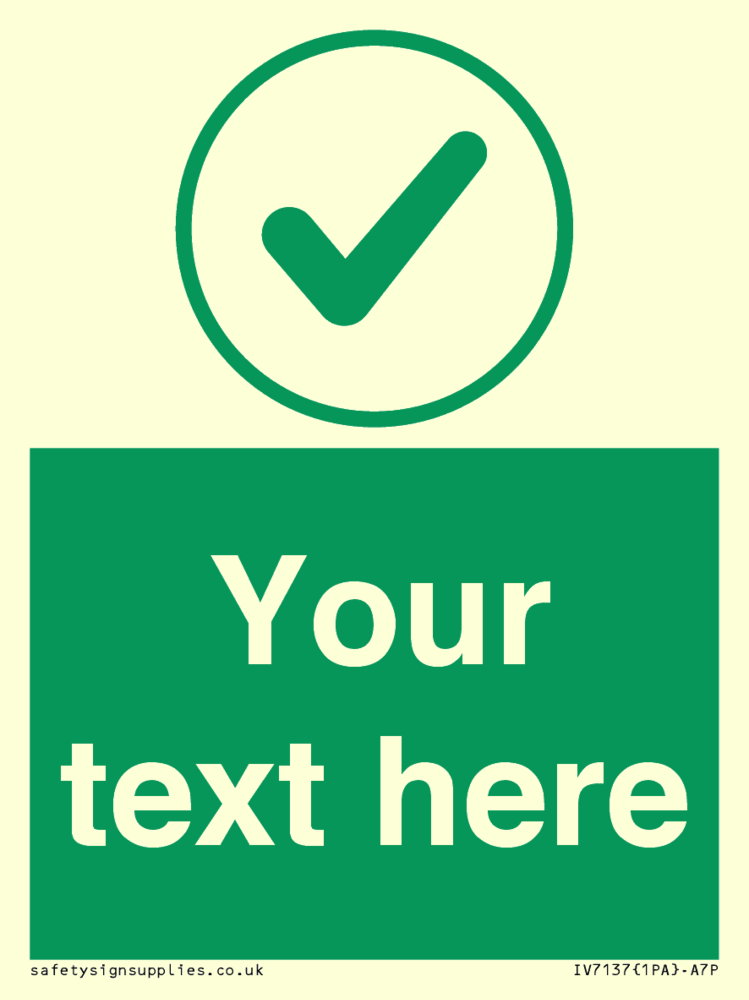 Sign Text: Your text here Dimensions: 75x100mm Material: Vinyl Photoluminescent sticker Orientation: Portrait Text Colour: White Background Colour: Green More...