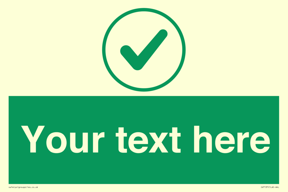 Sign Text: Your text here Dimensions: 300x200mm Material: Vinyl Photoluminescent sticker Orientation: Landscape Text Colour: White Background Colour: Green More...