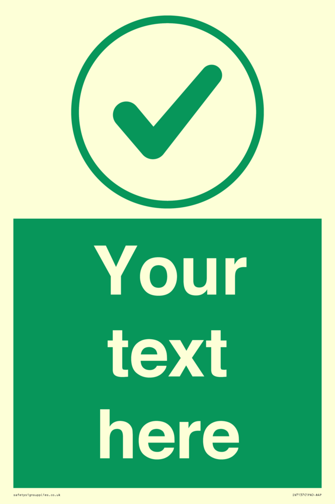 Sign Text: Your text here Dimensions: 200x300mm Material: Vinyl Photoluminescent sticker Orientation: Portrait Text Colour: White Background Colour: Green More...