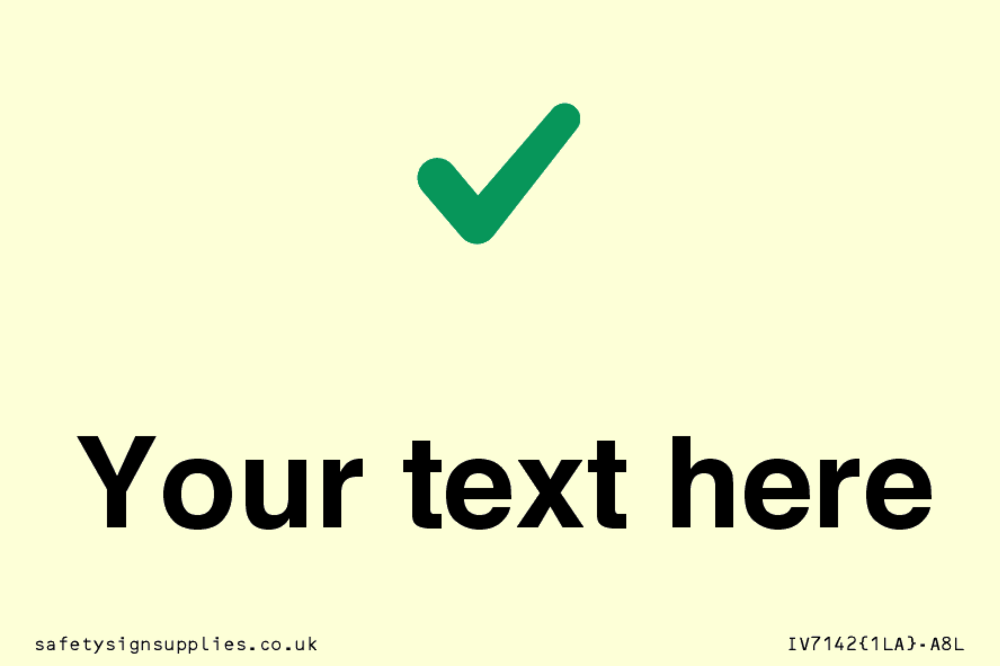 Thickness / Depth: 170microns Durability: 3-5 years Mounting Surface: flat Materials: Sticker Material Colour: Glow in the Dark Custom Text: Yes Language: ENGLISH Language (EN) Symbol: I017 : Green tick Internal Layout: 1LA : 1 landscape pod in a Landscape Region: UK