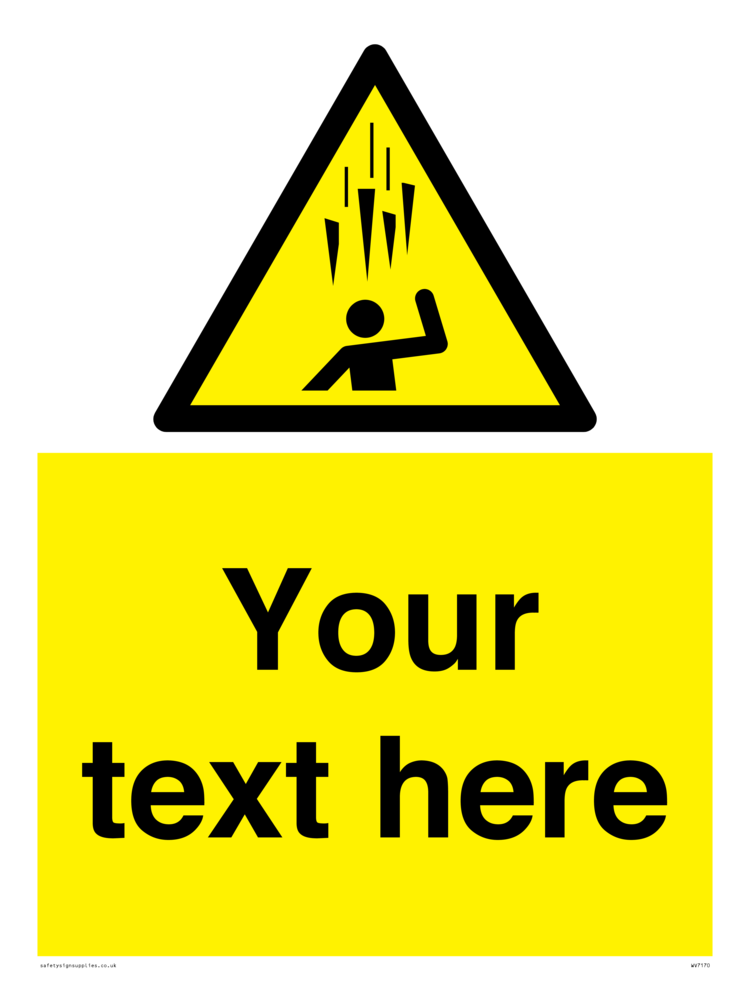 Suitable for mounting on a door. Suitable for mounting on cladding. This product is design to be mounted on the ceiling. Custom signs contain the text required by the customer. With your your text and a standard safety sign symbol - a bespoke sign can fit any requirement. Signs in this range are from our maximum choice range. Giving you the most choice of signs available in the UK.