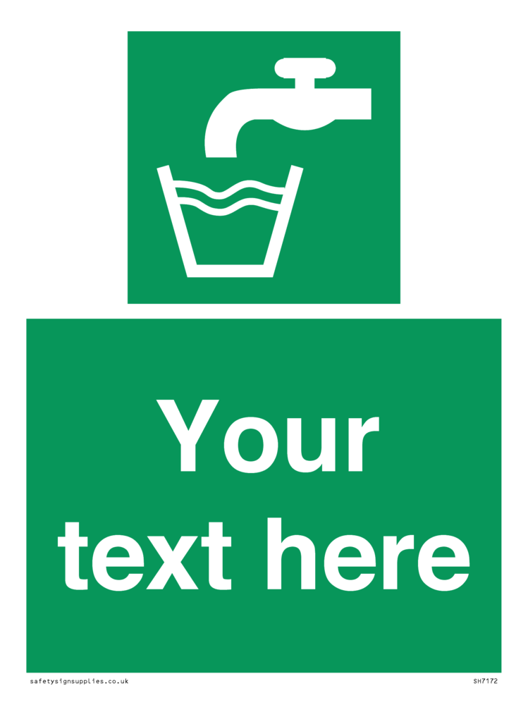 This sign contains a drinking water symbol - tap with water flowing into cup in white on green background.